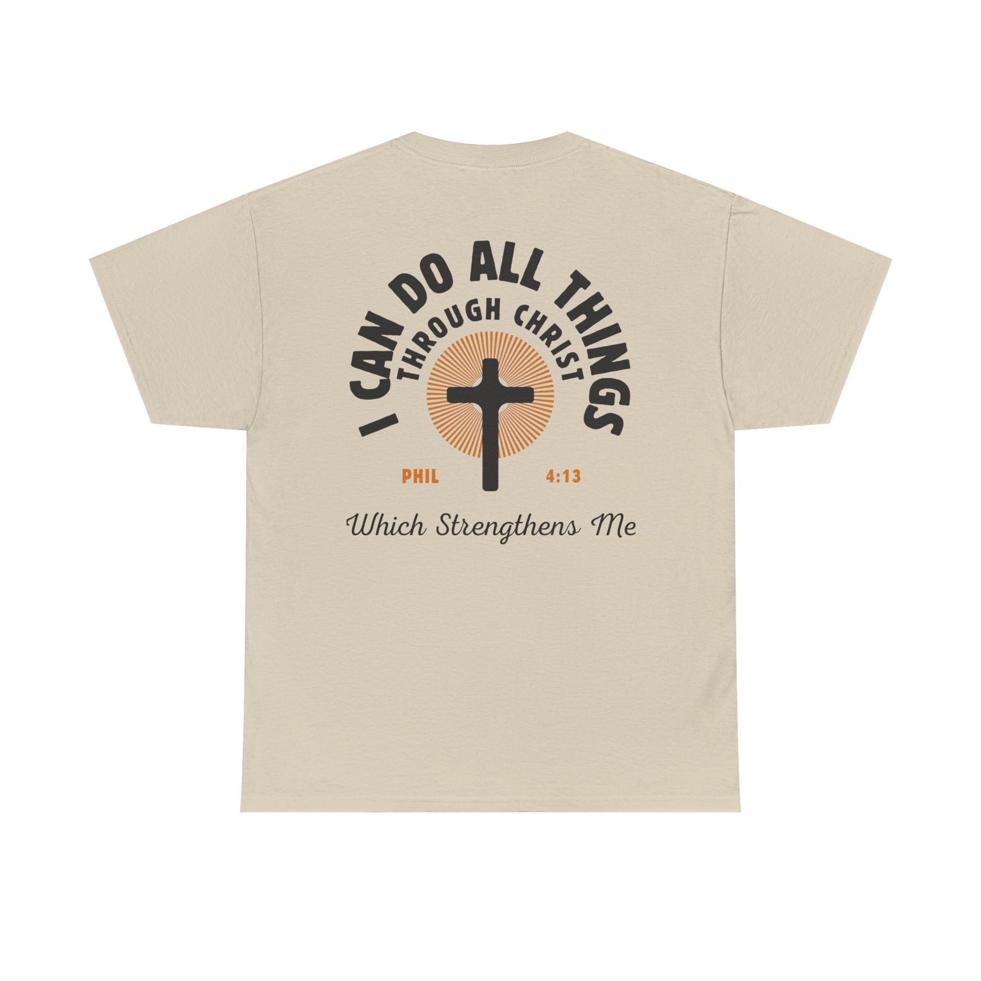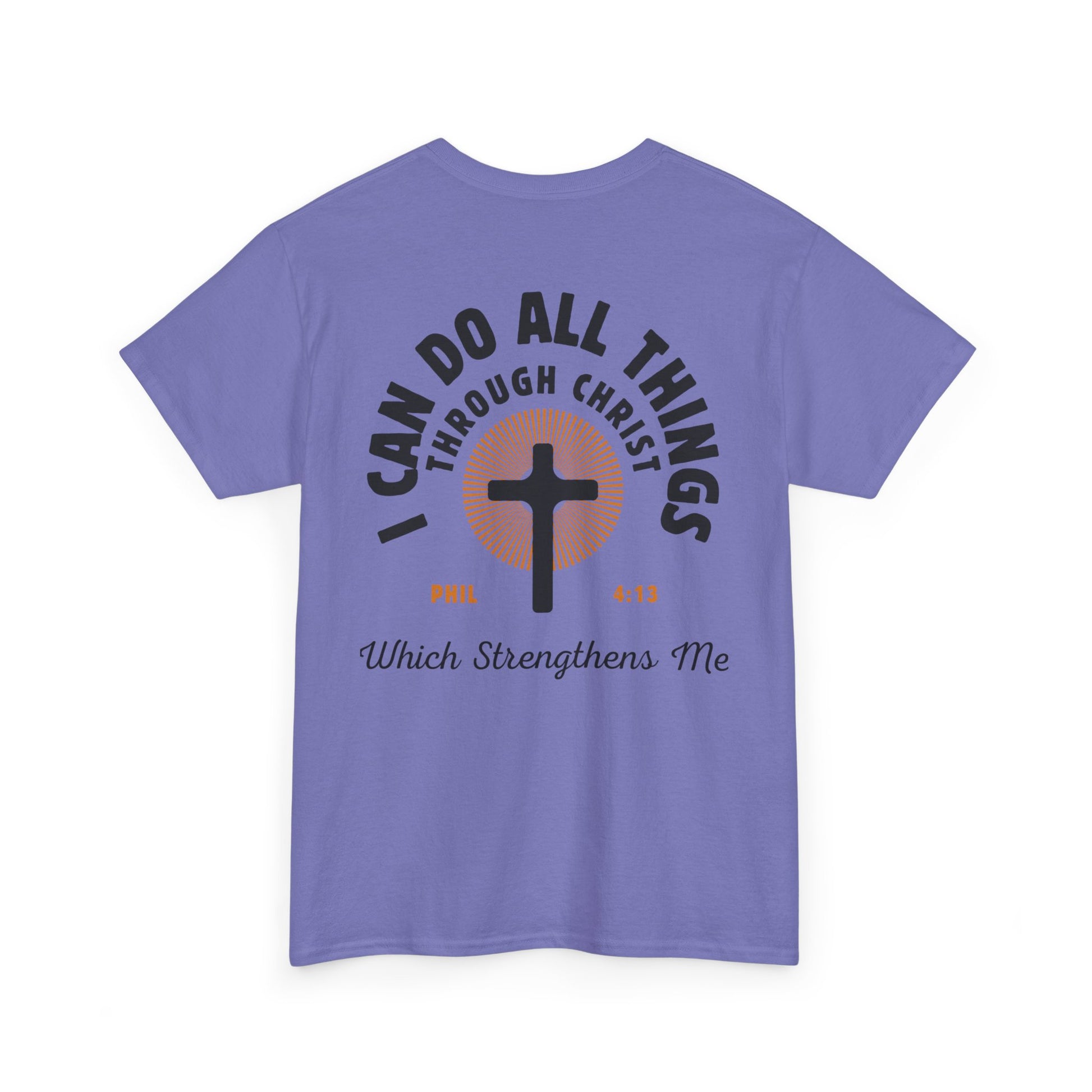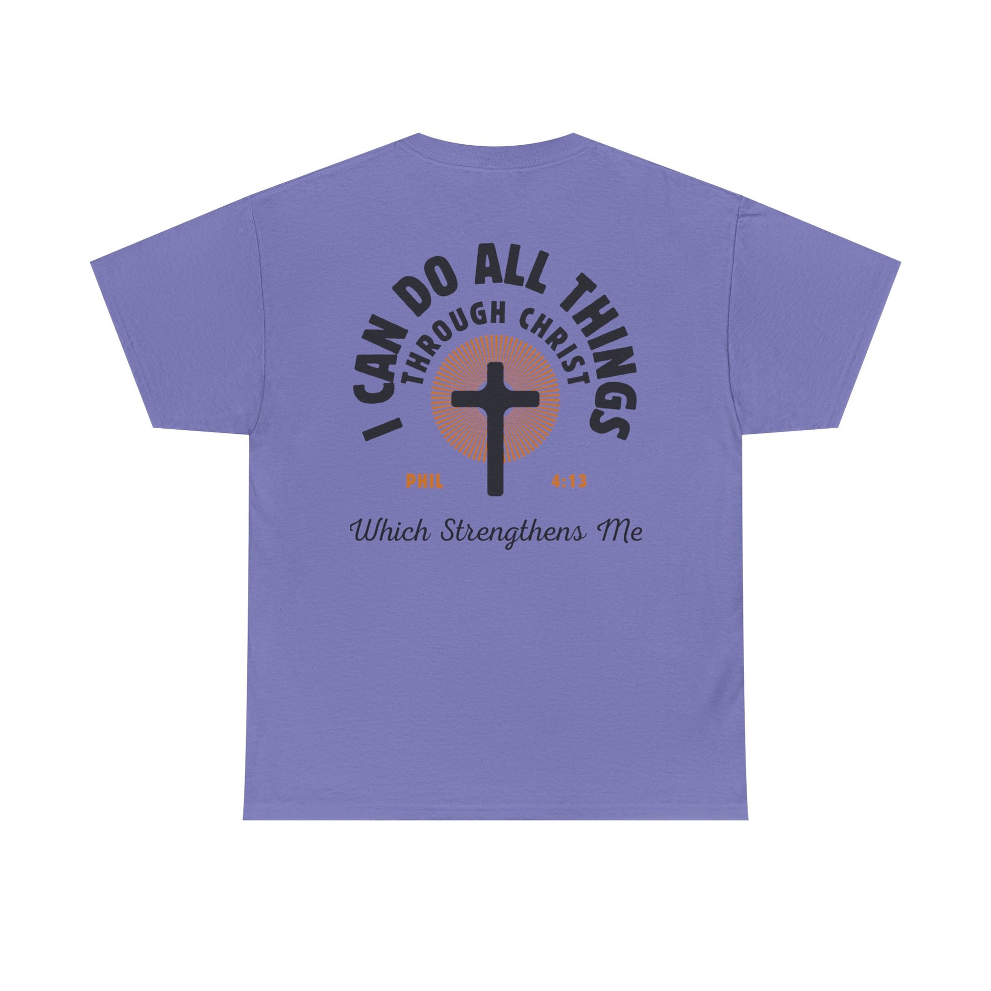 Empowering and inspirational T-Shirt featuring the phrase 'I can do all things through Christ'. Perfect for those seeking positivity and strength in their daily life. Ideal for Christians, believers, and those looking for a spiritual boost. Suitable for religious holidays, church events, and everyday wear.