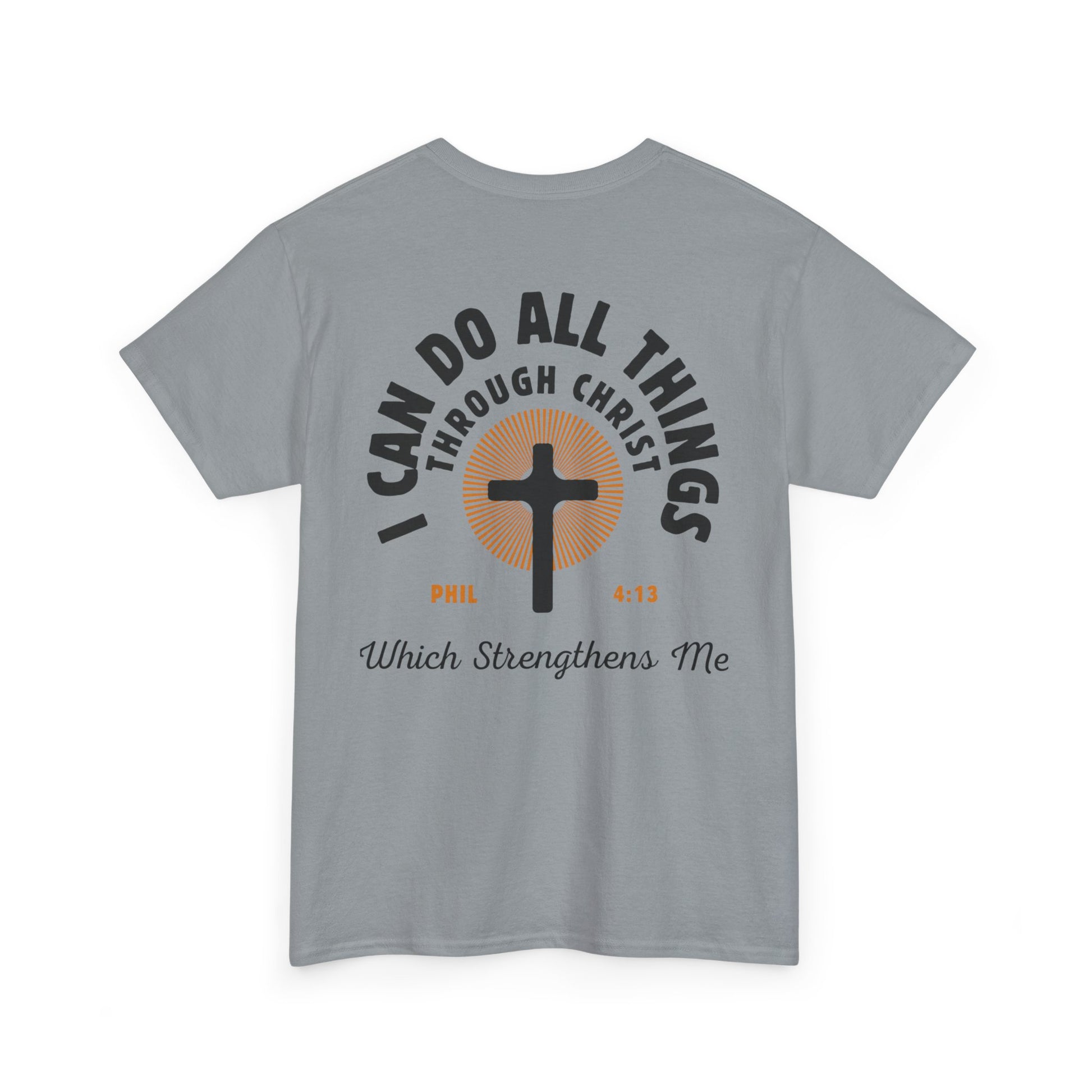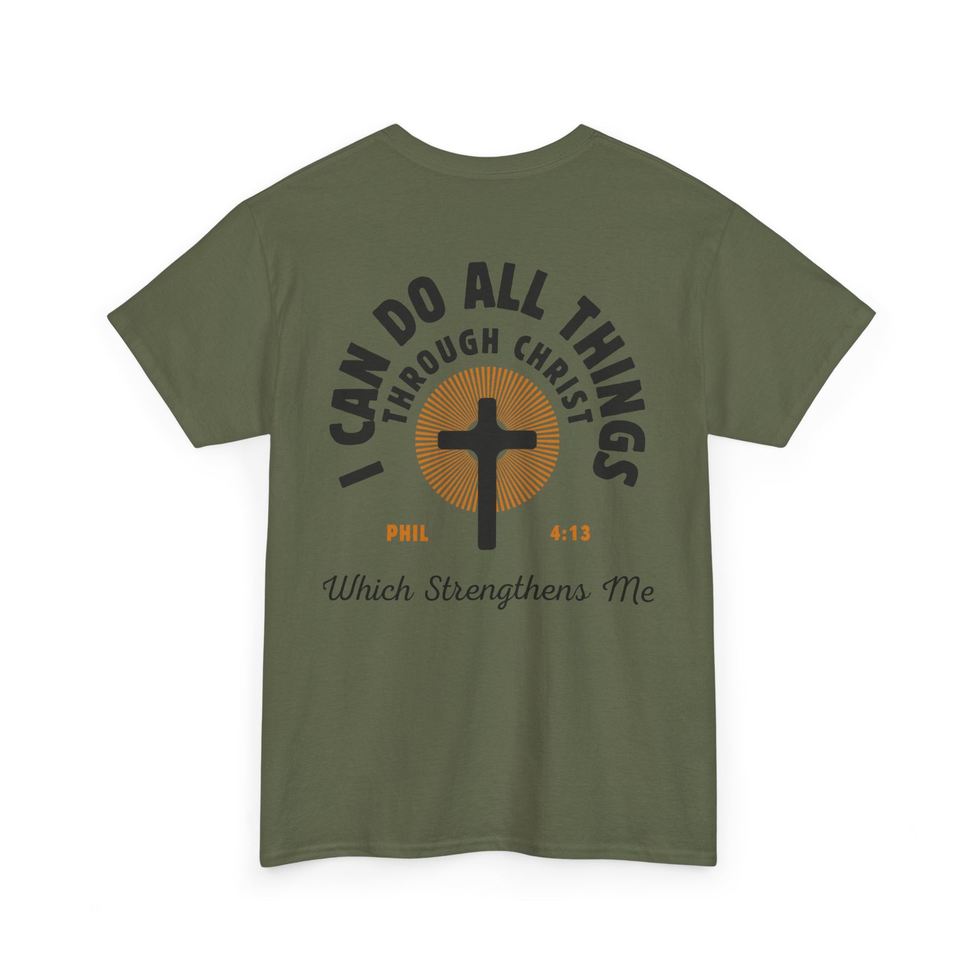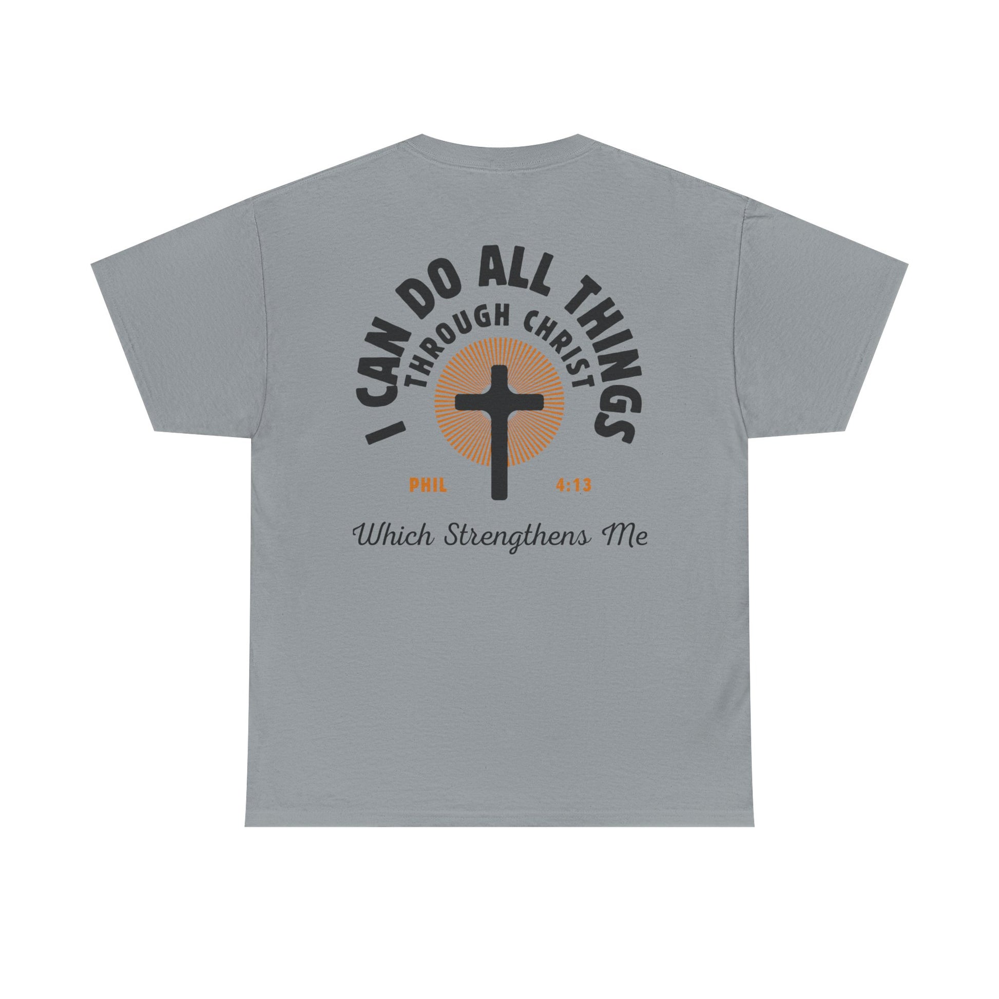 Empowering and inspirational T-Shirt featuring the phrase 'I can do all things through Christ'. Perfect for those seeking positivity and strength in their daily life. Ideal for Christians, believers, and those looking for a spiritual boost. Suitable for religious holidays, church events, and everyday wear.